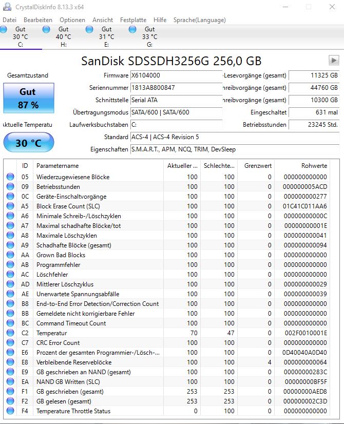 Die Smart Werte sehen so aus, siehe Screenshot.