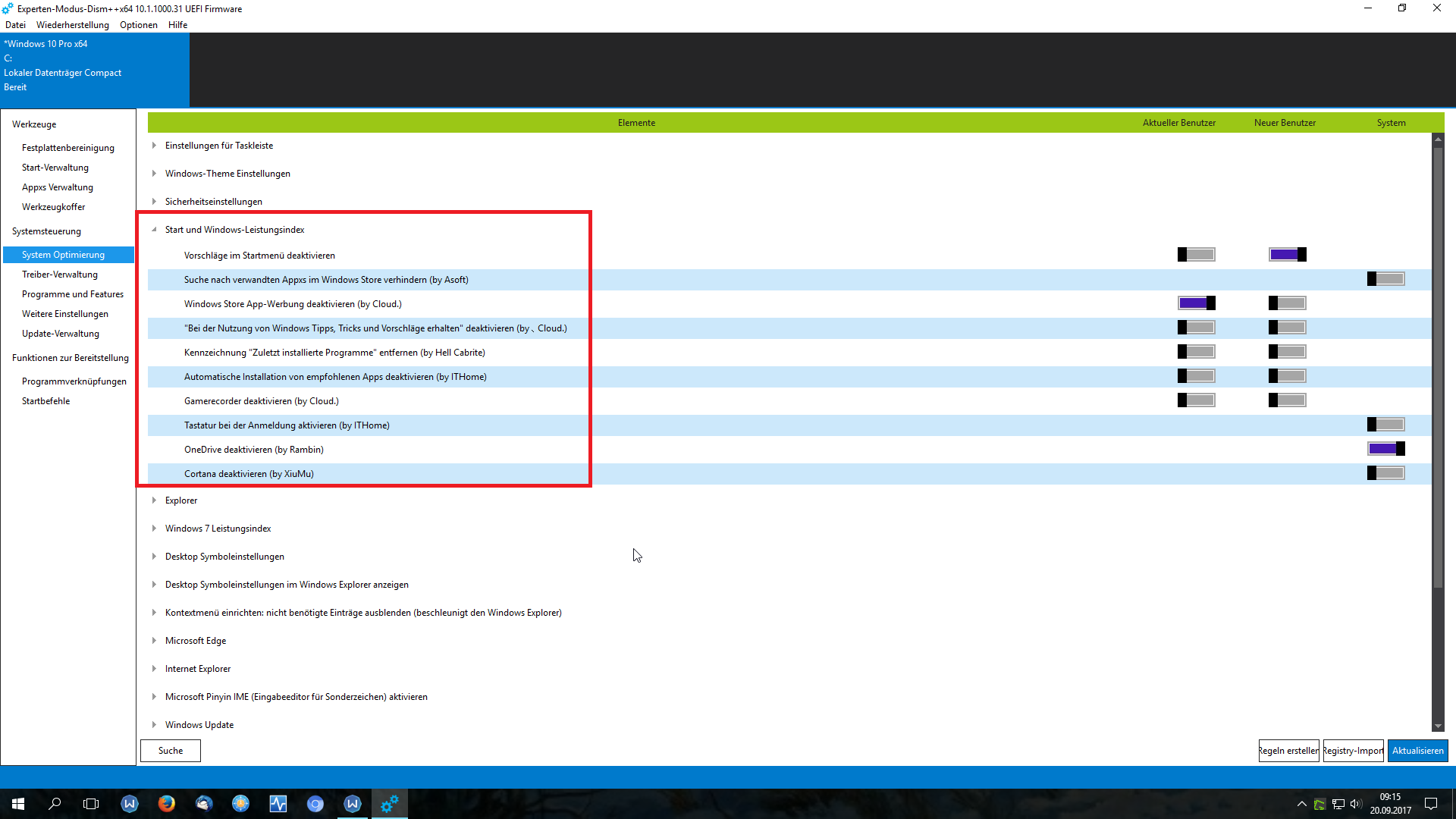 Lade dir das Dism++ Tool von www.chuyu.me , und deaktiviere in " Start & Windows Leistungsindex " die einzelnen Teile