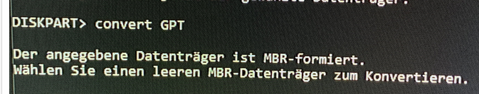 Ich habe überprüft ob meine Festplatte die Art hat, ich weiß nicht mehr wie die heißt GPT oder so