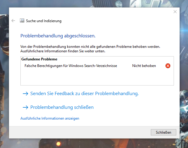EDIT: Nutze ich die Problembehandlung für die Windows Suche erkennt Windoof scheinbar einen Fehler, kann ihn aber nicht beheben und ich wüsste auch nicht wie. Berechtigungen im Ordern C:\ProgramData\Microsoft\Search zu ändern (Vollzugriff) bringt leider nix. Ich weiß sonst nicht mehr wie ich es beheben soll: