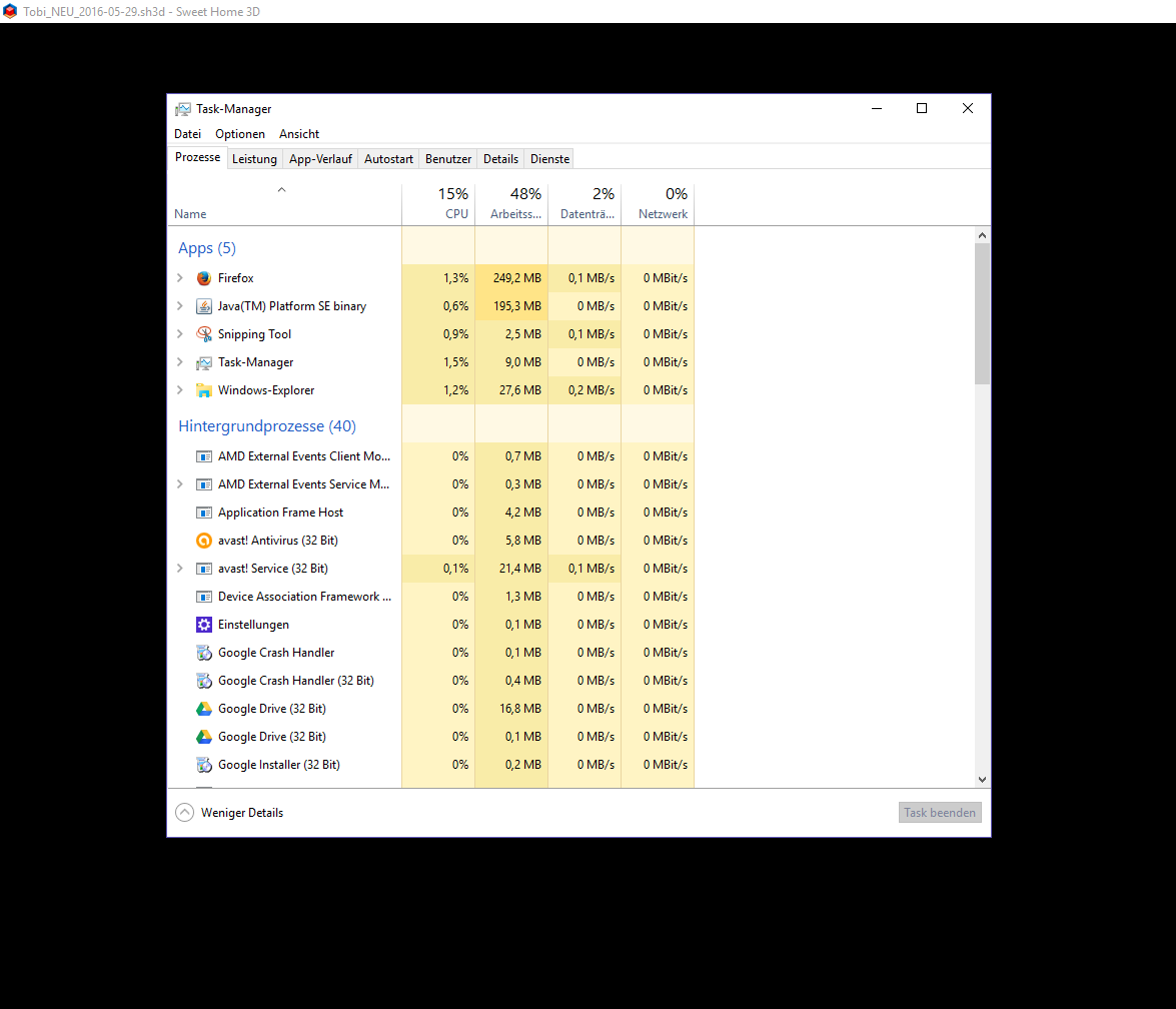 Hier hat sich mein Wohnungsplaner verabschiedet und zeigt nur mehr ein schwarzes Bild. Im Taskmanager ist er allerdings nicht auffindbar also muss ich jedes Mal das ganze System neu starten.