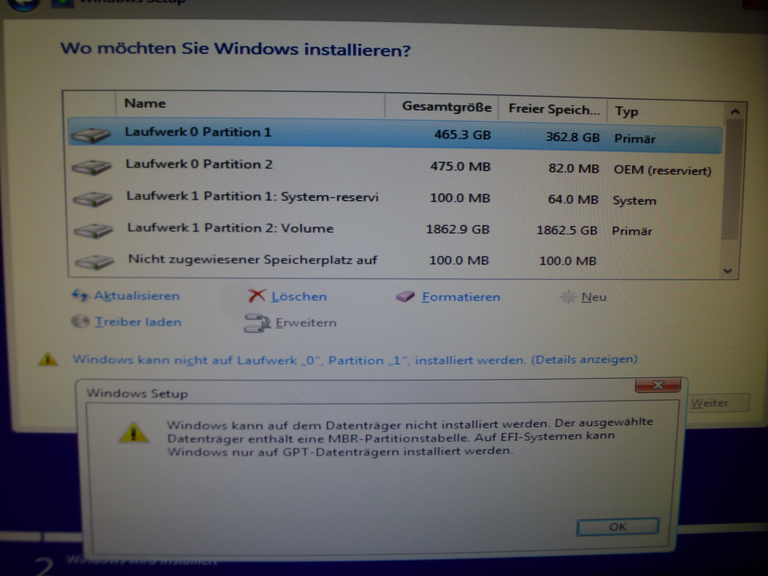 steck die HDD ab, und dann bei dem Bild alle Partitionen von der SSD löschen und win10 auf den leeren freien Speicher installierenNvidia-User schrieb:Es folgt jetzt folgende Fehlermeldung (sioehe Bild), anscheinen kann neue Windows10 64bit nicht auf die SSD installiert werden, aber warum ??