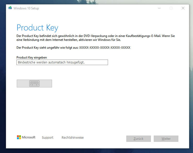 Während des Updatevorgangs fragt mich der Assistent nach meinem Win 10 Key.