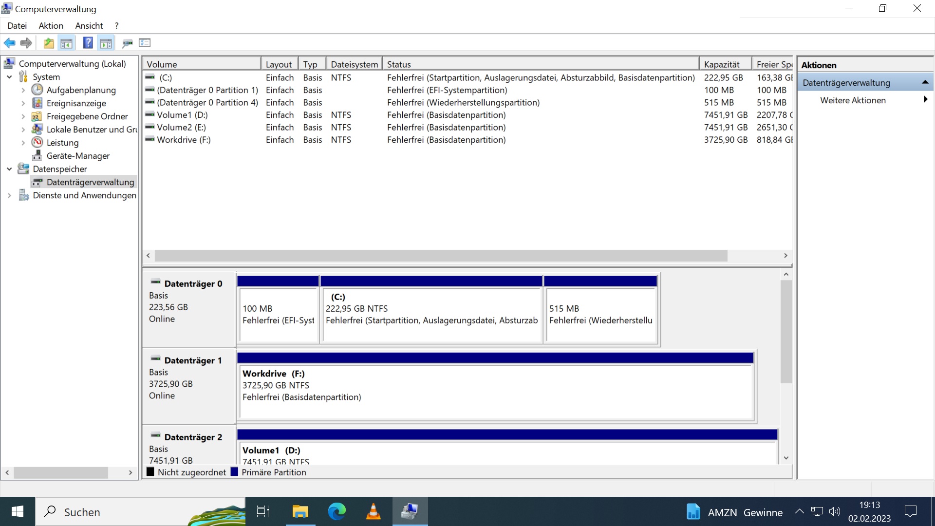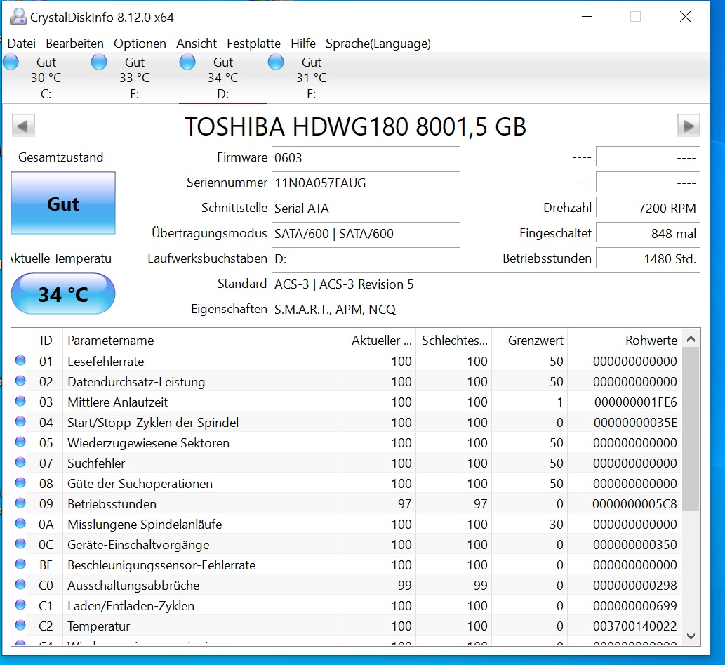 Ich lasse ein Medienserver/Datengrab auf einem alten HP ProDesk mit Win10 laufen. Im Moment sind da eine SSD als Systemplatte, eine 4TB Toshiba und zwei 8TB Toshiba Platten dran. Die Festplatten laufen einzeln, also nicht als Raid oder übergreifender Datenträger.