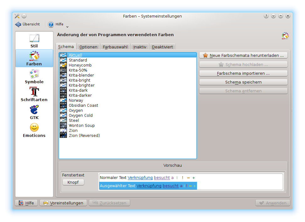 Also unter Kubuntu gibt es ein Einstellungsfeld für Farben. Da gibt es mehrere vorgegebene Schemata und man kann sich auch selber welche erstellen.