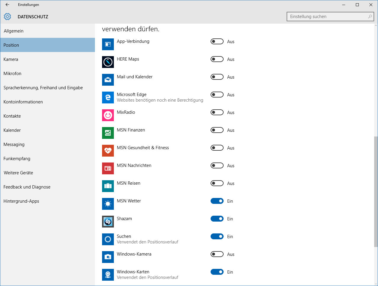 Na ja, jetzt wird's etwas haarspalterisch. Hab eben gerade nochmal geschaut ... was für ein Irrsinn, es gibt unter Datenschutz alleine 13 Kategorien, jede einzelne wieder mit einigen bis vielen Einstellmöglichkeiten und alle sind erst mal aktiviert.Yuuri schrieb:Und durch genau was will Windows 10 den Standort wissen und nicht durch eben bspw. die Wetter App, Shazam oder jede andere App, die den Standort haben möchte?