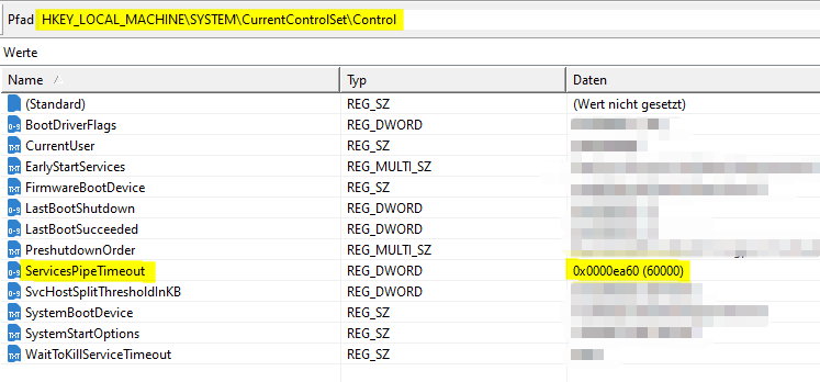 Erhöhe mal zum Testen das Timeout (30000 ->60000). Sollte der Eintrag "ServicesPipeTimeout" nicht vorhanden sein, Neu anlegen.