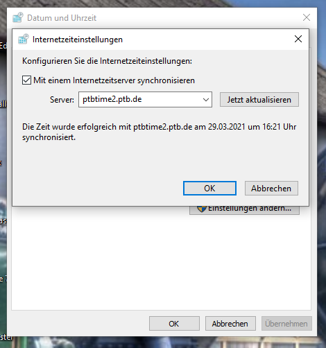 Bei den beiden Standardservern time.windows.com und time.nist.gov kann ich das per ping noch nachvollziehen, da kommt tatsächlich keine Antwort. Ich habe es dann alternativ erst mit ntp.metas.ch und nachfolgend mit pool.ntp.org versucht, welche beide per ping antworten. Auch hier allerdings schlägt es mit einer Zeitüberschreitung fehl, was ich dann nicht mehr verstehe.