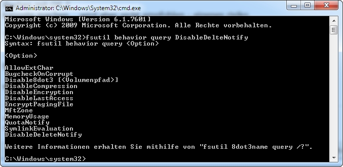 Wenn DisableDeleteNotify = 0 erscheint, dann sollte TRIM aktiviert sein.