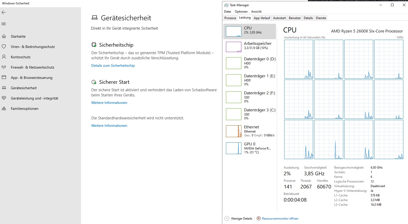 Achso. In der Systemsteuerung unter Gerätesicherheit wird dann der Punkt "Kernisolation" nicht mehr angezeigt, das ist immer der Fall, wenn im Taskmanager die Virtualisierung aus ist.