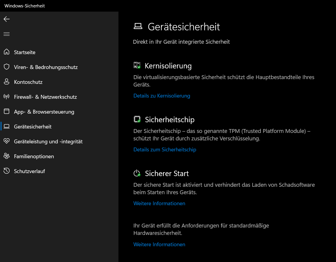 @Tiara G. Kannst du denn unter Windows Sicherheit > Gerätesicherheit > Kernisolierung > dann auf "Details zur Kernisolierung klicken > die Speicherintegrität einschalten?