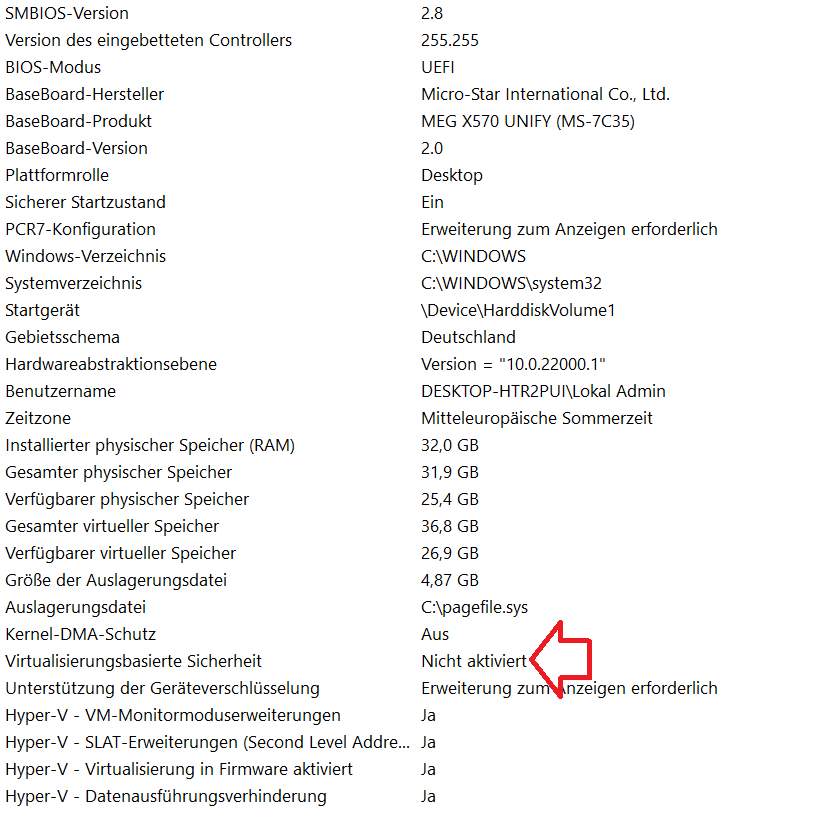Auf der einen Seite wird die Virtualisierungsbasierte Sicherheit bestätigt (Kernisolierung), unter MSINFO32 allerdings nicht!