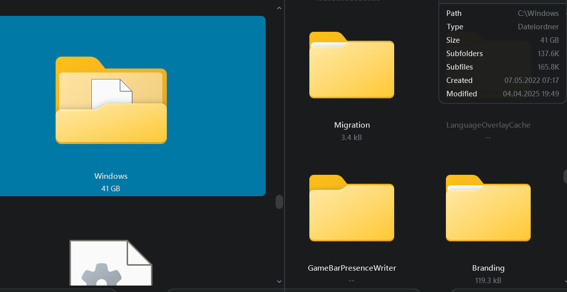 Ordergröße lässt sich auch mit Tools in den Windows Explorer integrieren - es hat aber eben Sinn warum das nicht dabei ist. Schonmal versucht die Ordner Größe von paar Millionen Files in Unterordnern zu ermitteln? Das schafft kein OS der Welt und keine Explorer Alternative der Welt ohne irgendwo eine indizierte Datenbank mit entsprechend aufgearbeiteten Größeninformationen. Dann kommen noch so nette Spielereien wie Symlinks dazu. Oder Dedup oder Blockreferenzierung bei ReFS bspw. und das ganze ergibt einfach keinen Sinn mehr die Ordnergröße mit darzustellen. Wer es doch will, nutzt halt eines der Mittel um es anzeigen zu lassen.