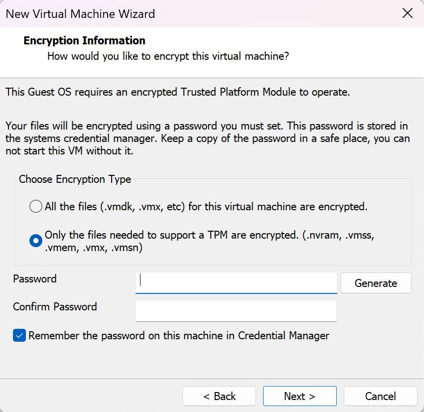 Und man kann keine WIN11-VM ohne die VMware-Verschlüsselung erstellen (evtl. mit gemoddeter *.vmx)