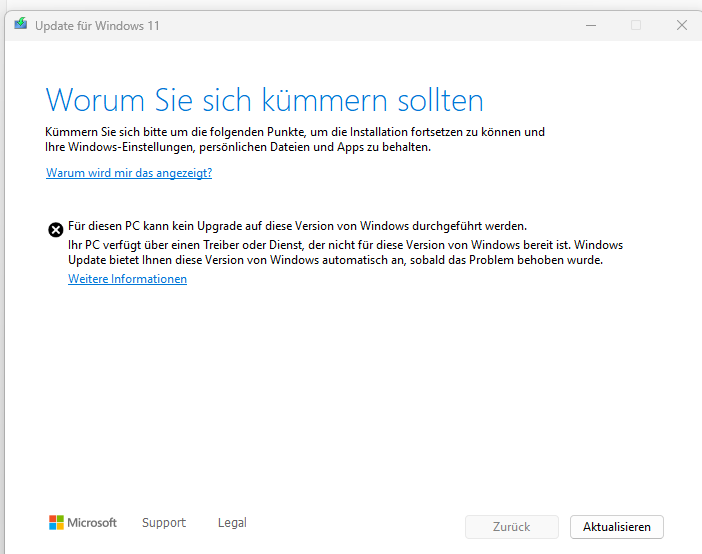 Für diesen PC kann kein Upgrade auf diese Version von Windows durchgeführt werden.