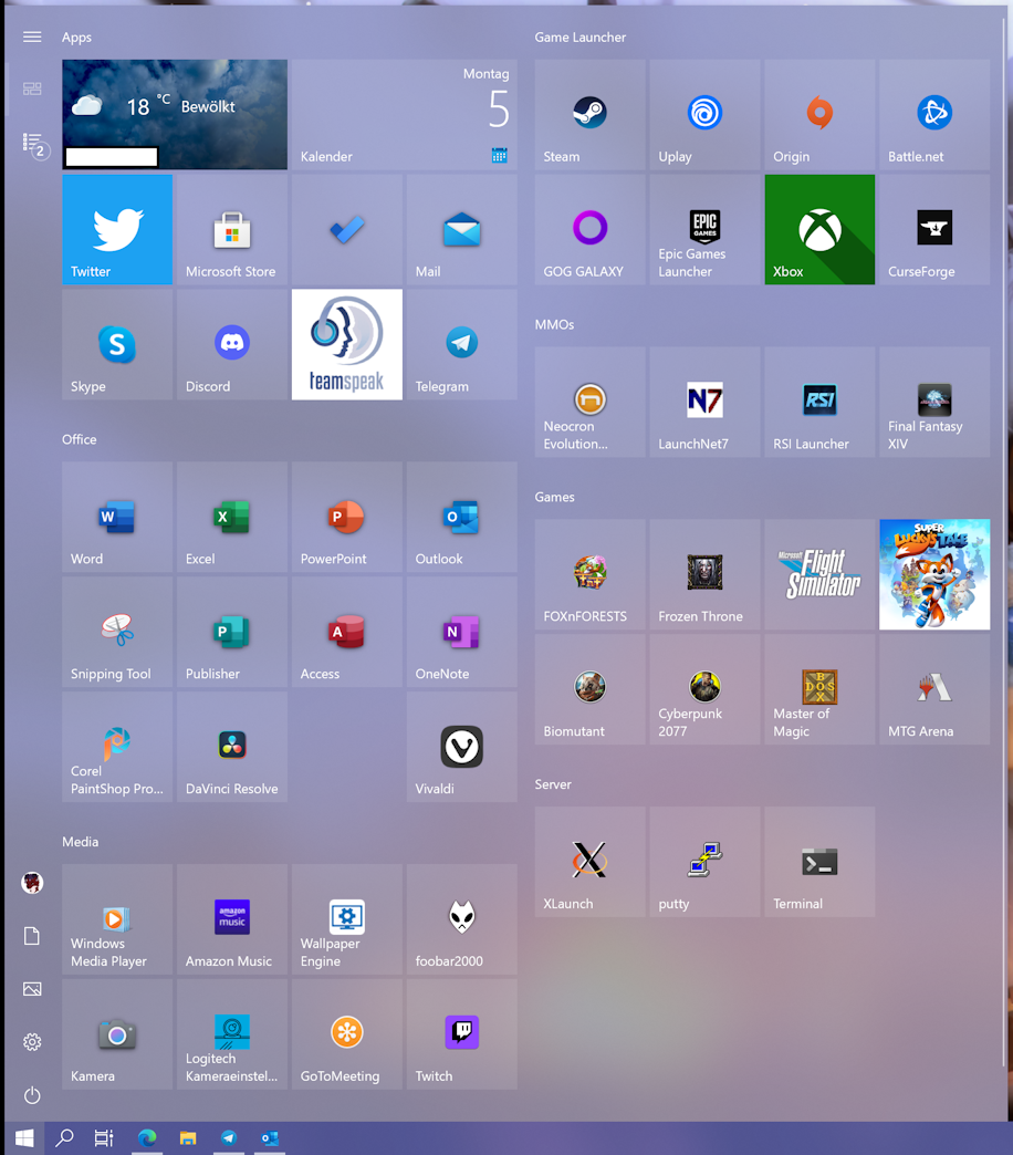 Games kann man sich als Ordner mit Verknüpfungen unten im Explorer Icon anheften, die häufig genutzten Launcher hab ich auch alle direkt in der Schnellstartleiste und alles andere ist mit Windows + den ersten 1-2 Buchstaben der App auch direkt gefunden.