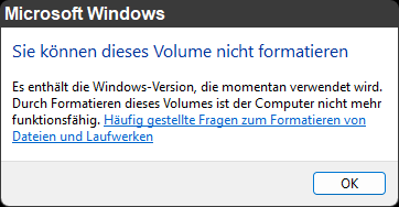 mir ist zufälligerweise in Windows 11 aufgefallen, ob es bei der 10 schon war, weiß ich gerade nicht, dass das Laufwerk wo Windows installiert wurde, logischerweise nicht formatiert werden darf, was ja sinnvoll ist, da ja bei sehr alten Windows Versionen das Laufwerk gelöscht werden konnte und alle Daten wie auch das BS waren weg 😂