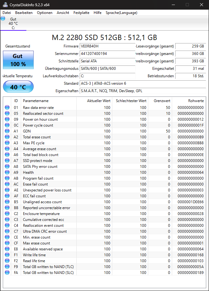 Außerdem habe ich CrystalDiskInfo installiert und ausgeführt (siehe Foto).