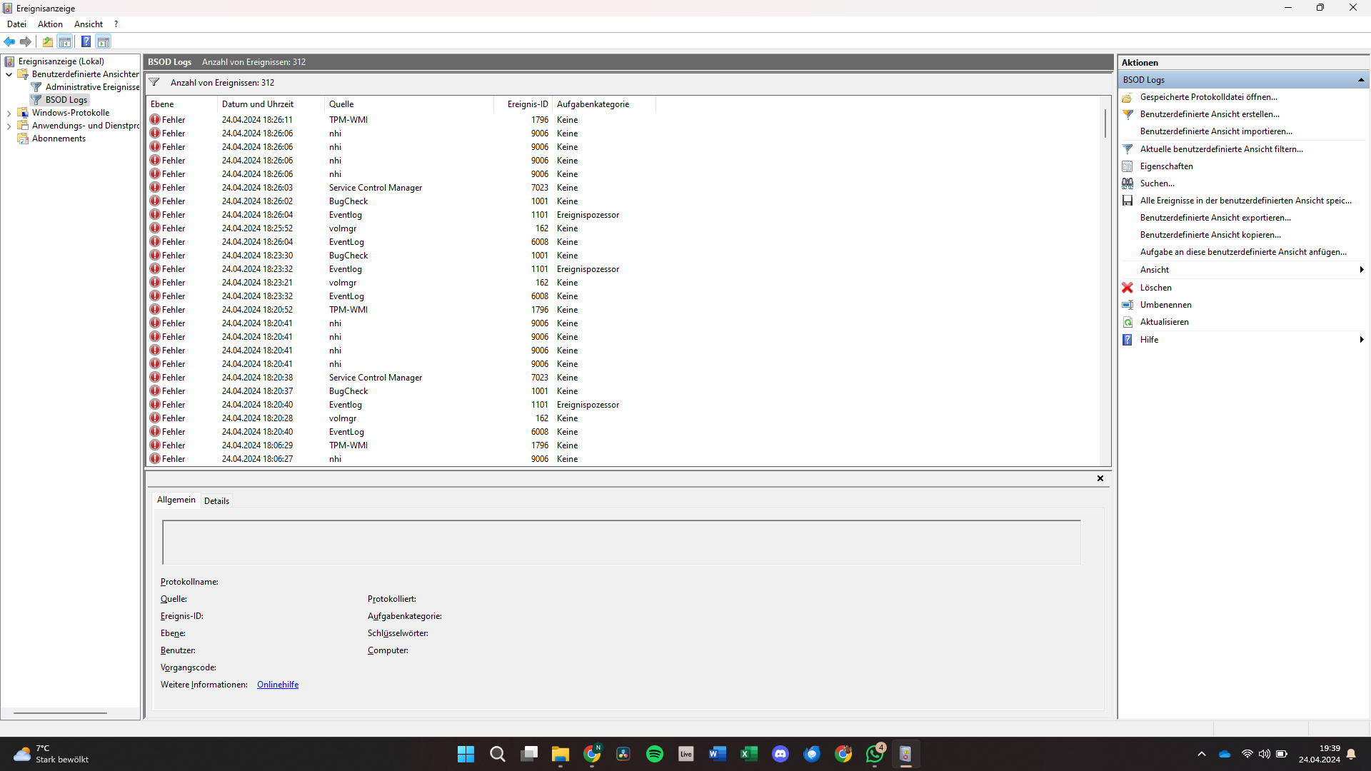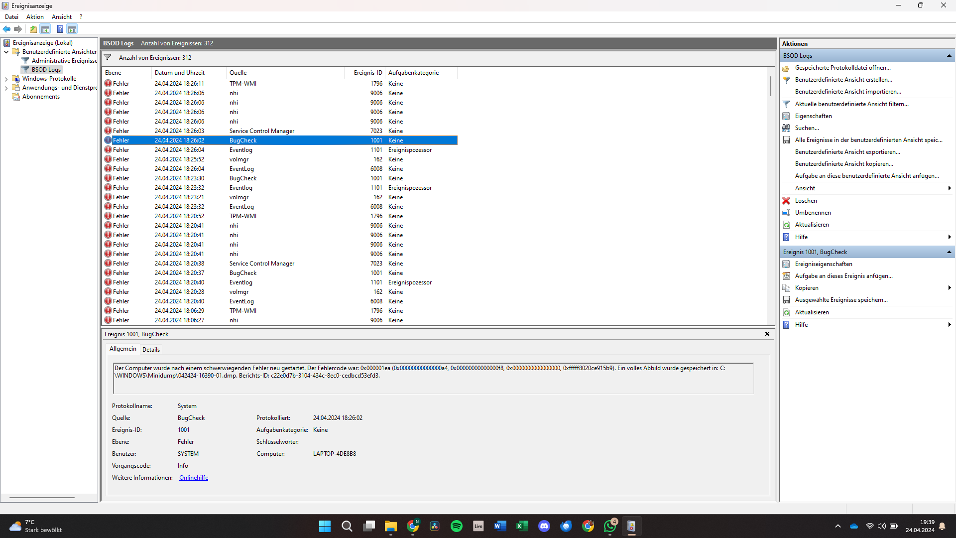 Ich habe erst einmal in der Ereignisanzeige alle BSOD-Logs auflisten lassen (siehe Foto) und dann angefangen mdsched und sfc durchlaufen zu lassen. mdsched erbrachte keine Fehler, sfc ist zwischendrin mit einem erneuten Bluescreen abgebrochen.
