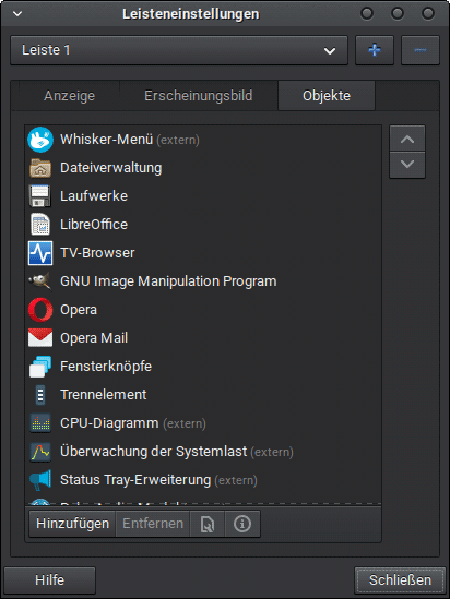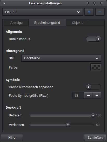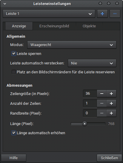 Die Leisten (Plural) kann man auch überall positionieren: An jeden Rand, in jede Ecke und sogar beliebig irgendwo auf dem Bildschirm (keine Ahnung wofür - aber besser man kann es und braucht es nicht, als umgekehrt). Über die ganze Breite/Höhe, oder sich automatisch vergrößernd zentriert. - Die Einstellmöglichkeiten habe ich auch angehängt.
