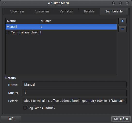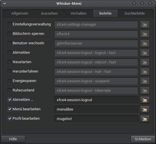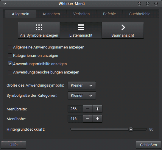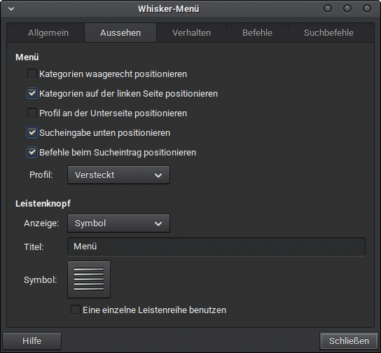Anbei die Einstellmöglichkeiten des kostenlose free open source Whiskermenüs, des des kostenlose free open source Xfce-Desktops: Das kann man überall auf jede Leiste positionieren. - Auch mehrfach: Z. B. in jede Ecke eins, die man unabhängig voneinander konfigurieren kann (z. B. eins für Grobmotoriker, wie das von Win11, ein anderes in Listenansicht, usw.)