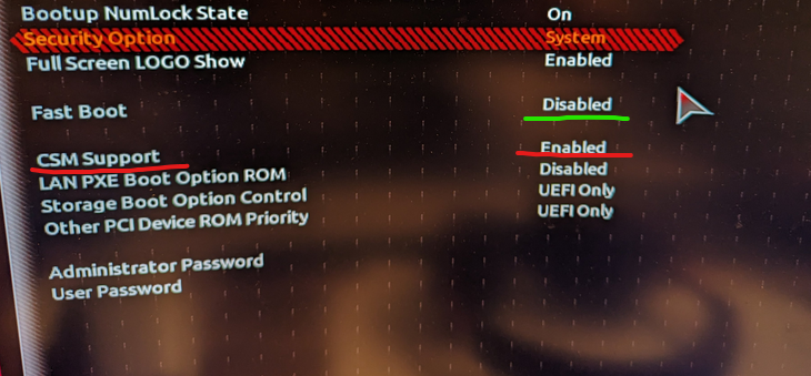 Das Bios ist auf "Storage Boot Option Control" "UEFI Only" eingestellt.