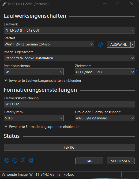 Hallo, habe erst selbst vor 5 Tagen eine Neuinstallation von Windows 11 Pro mit Rufus, vs.4.11 durchgeführt, verlief ohne Probleme. Was man braucht, wenn man die ISO damit lädt, ist selbsterklärend. Füge einmal zwei Bilder dazu ein. Die Anzeige 24H2 bitte ignorieren, habe die 25H2 installiert.