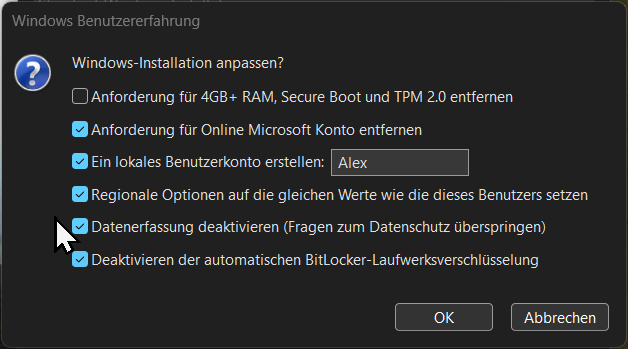 Drückt man den unten auf Start, kommt noch ein Extra Menü. Was ich ausgewählt habe, sieht man ja, meinen Namen habe ich eingegeben, weil Windows daraus gerne mal nur 3-5 Zeichen macht, oft sehr kryptisch.