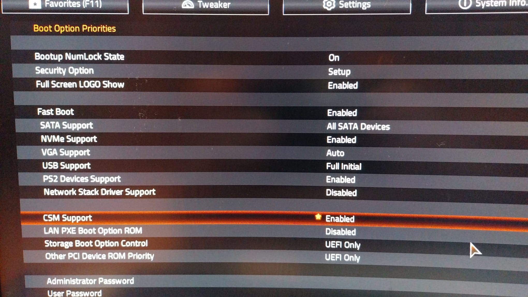 CSM Unterstützung ausschalten. Denke, du möchtest kein Linux auf dem PC installieren?