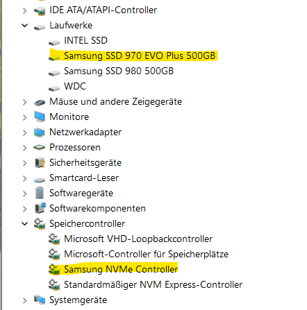 Win 10 mit installierten Samsung NVME Treiber der auch im Gerätemanager beim Laufwerk als genutzter Treiber angezeigt wird.