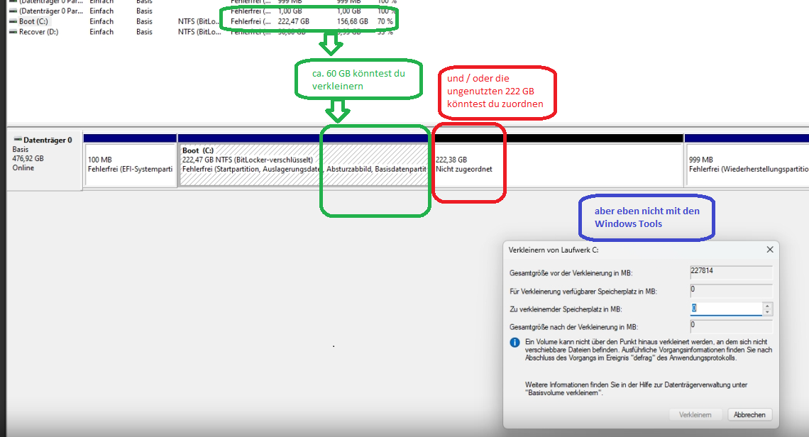 Da sind wir wieder bei meinem Basis-Problem: das Laufwerk C: läßt sich nicht weiter verkleinern.