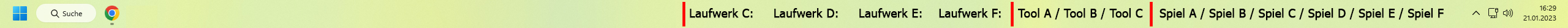 seit Ewigkeiten nutzte ich Ordner mit Inhalten (Spiele, Laufwerksbuchstaben, Tools) in der Taskleiste. Diese ordner konnte man über die Taskleiste importieren und der Inhalt wurde dann auf der Taskleiste ausgegeben. Man konnte dann auch den Namen des Ordners links einblenden und daran ziehen, um so die gewünschte Position zu bestimmen.