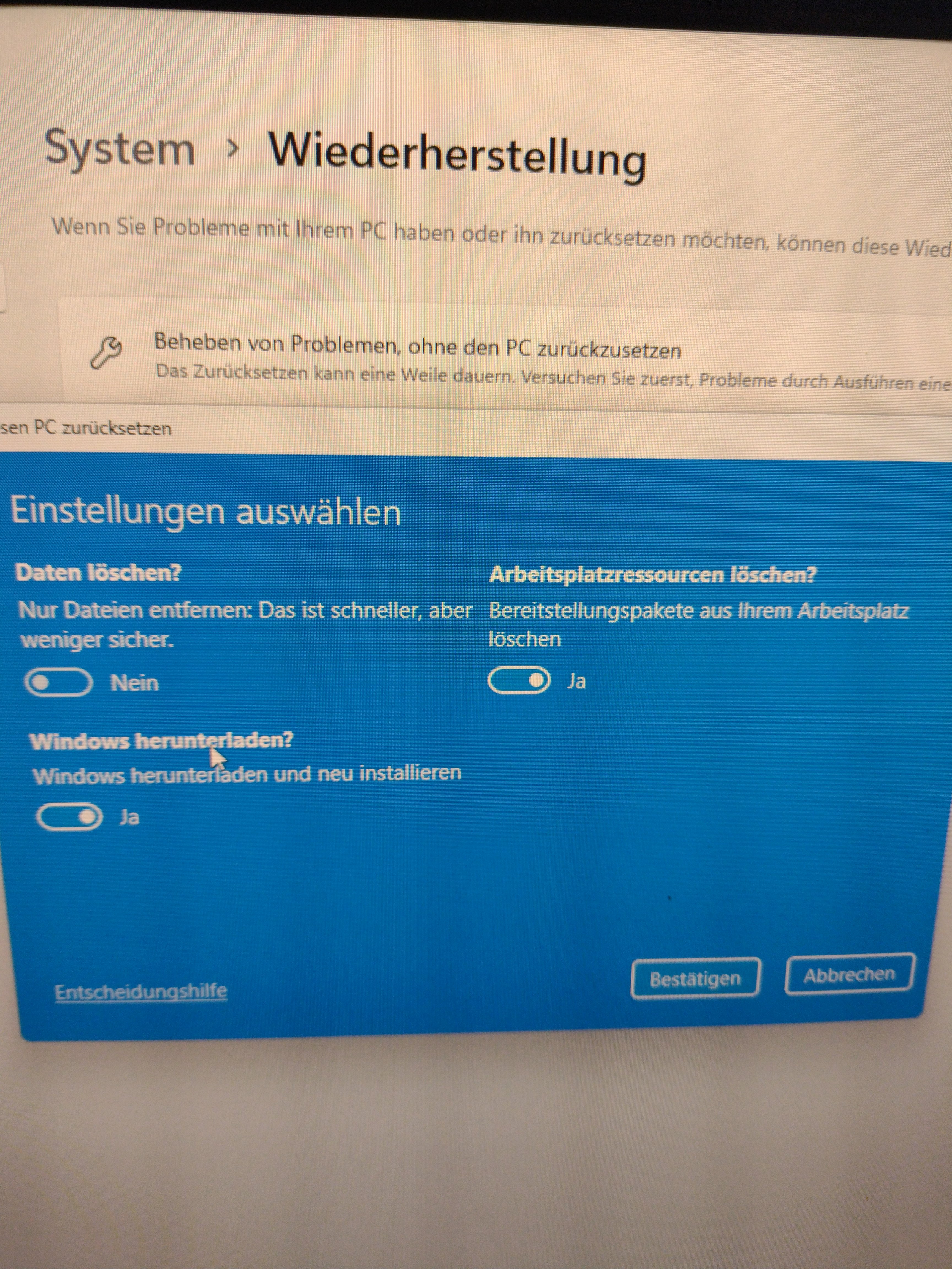 Schönen guten Tag an alle 👋 Ich möchte meinen PC mit Windows 11 zurücksetzen auf Werkseinstellung in älteren Videos habe ich gesehen dass manche Leute dort die Option hatten mit Laufwerk Bereinigung. Ich habe nirgendwo die Option das auszuwählen bei mir. Es wird nur angezeigt. Laufwerk wird nicht bereinigt. Bin ich jetzt zu dumm oder haben die diese Option entfernt? Vielen herzlichen Dank im voraus für jeden hilfreichen Tipp.