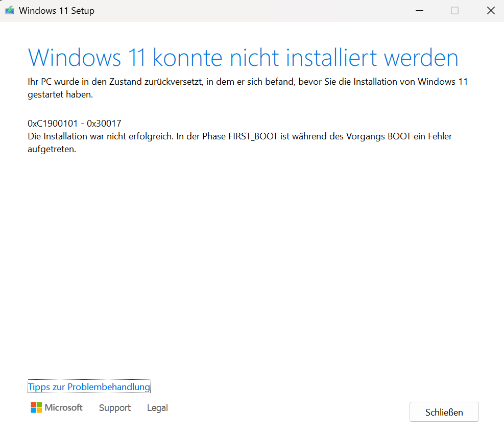 habe derzeit Win 11 Pro 23H2 installiert und möchte gerne auf 24H2 aktualisieren. Habe mir die ISO runtergeladen, entpackt und über Setup direkt im laufenden Windows ausgeführt (USB Stick über Rufus auch schon erstellt, mit dem gleichen Fehlerbild)