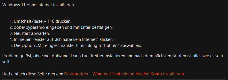 Leider klappt das nicht. Sobald der USB-Stick bootet, möchte er einen Hardwaretreiber. Windows Setup kann somit nicht ausgeführt werden. Hab schon 2 Sticks probiert (USB 2 und USB 3). Ohne Erfolg!