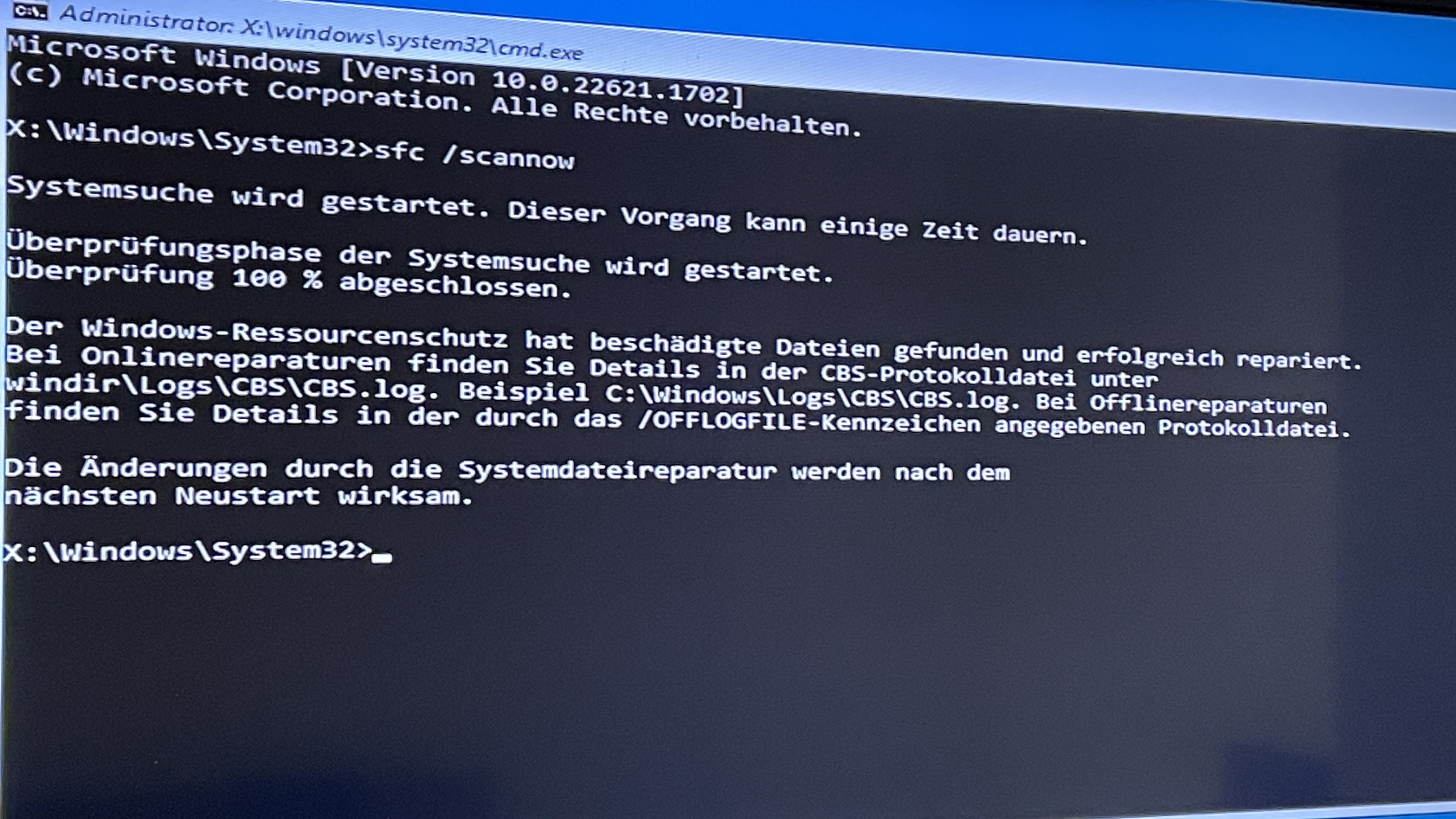 Hallo, und zwar habe ich folgendes Problem, und zwar starte mein Windows 11 nicht also der Bildschirm wird einfach schwarz. Wenn ich den PC einschalte, ist alles normal bis dann normalerweise Windows kommen sollte, da kommt nichts, habe es bereits im abgesicherten Modus gestartet, leider nicht geholfen. Dann habe ich ein sfc /scannow durchgeführt das hat ein Fehler erkannt, und zwar nach dem ich den PC dann wieder ein geschaltet habe, ging es immer noch nicht
