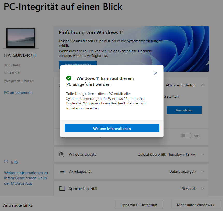 Generell wäre es wünschenswert wenn der Assistent anzeigt warum das Gerät nicht kompatibel ist (am besten auch gleich mit Tipps wie man es beheben kann, sofern möglich).DocWindows schrieb:Mein Surface Go 2 fällt auch durch. Vielleicht überarbeiten sie ja ihren Assistenten nochmal.