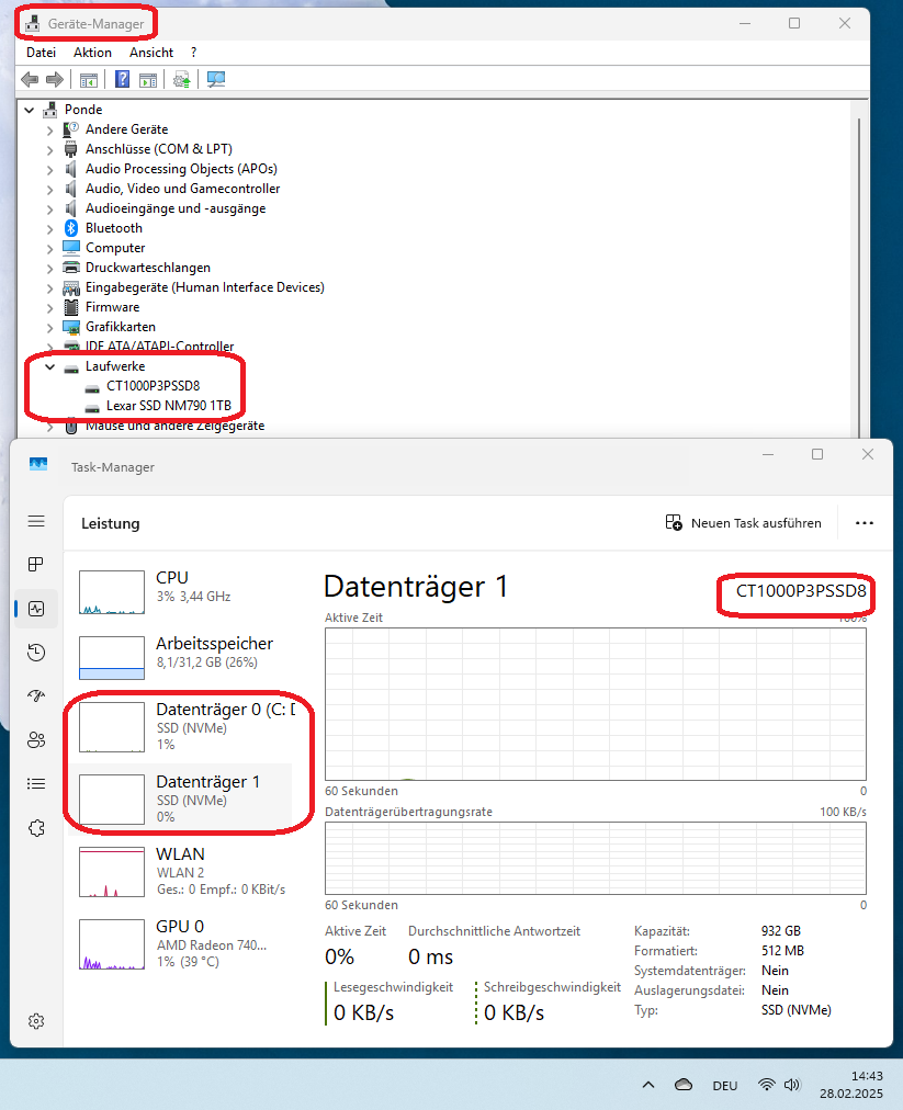 dann führe mal WinSAT diskformal in einer CMD (gestartet als Admin) aus, das testet die Platten und damit müsste der Taskmgr die Plattentyp korrekt anzeigen.