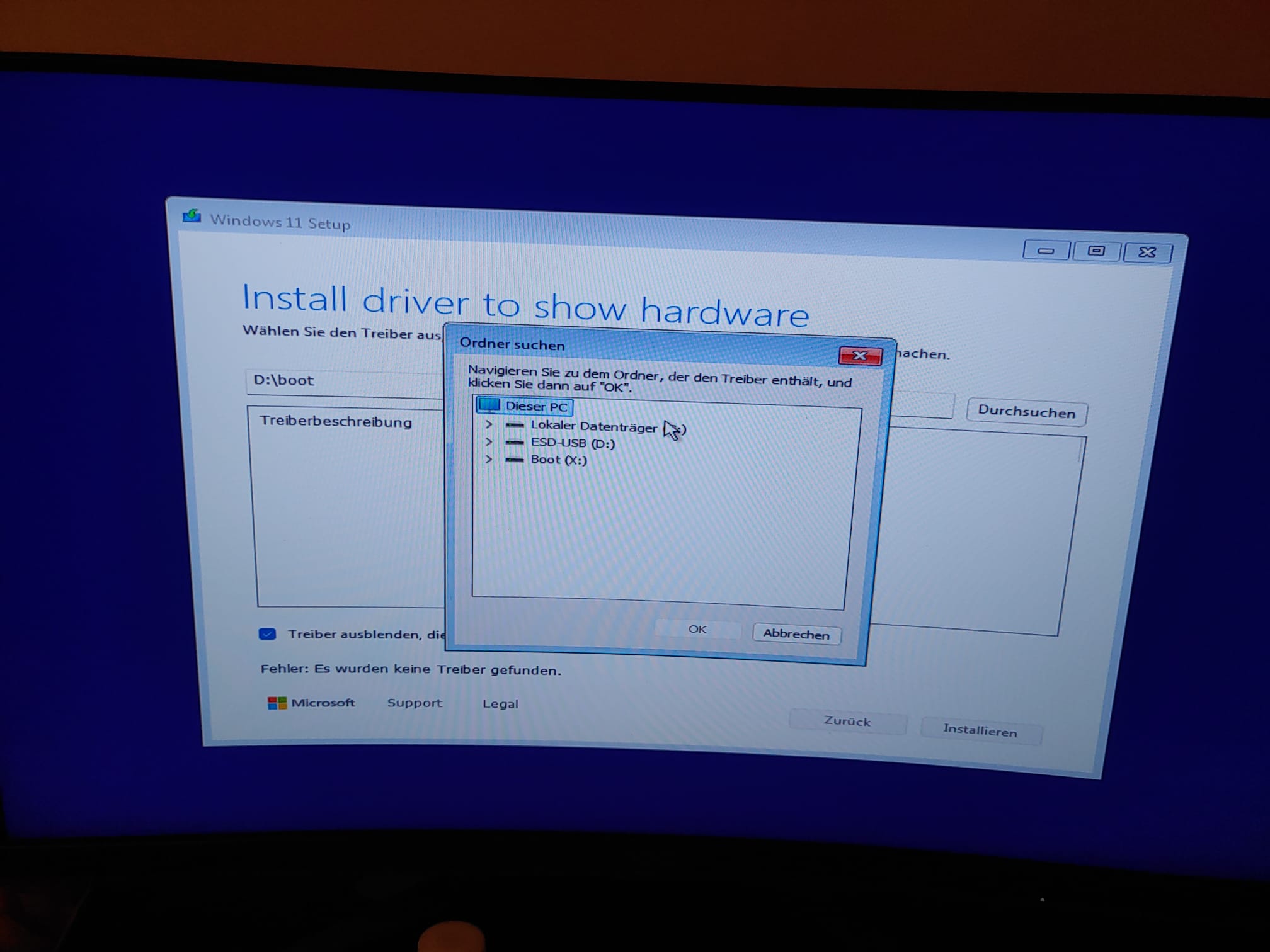könnt ihr mir helfen? Ich habe ein Gigabyte B650 Gaming X AX V2. Wenn ich versuche, Windows 11 zu installieren, erscheint der Fehler auf dem folgenden Bild. Egal, welche Festplatte man auswählt, es heißt: „Fehler: Es wurden keine Treiber gefunden.“
