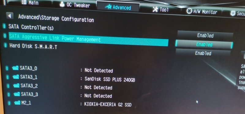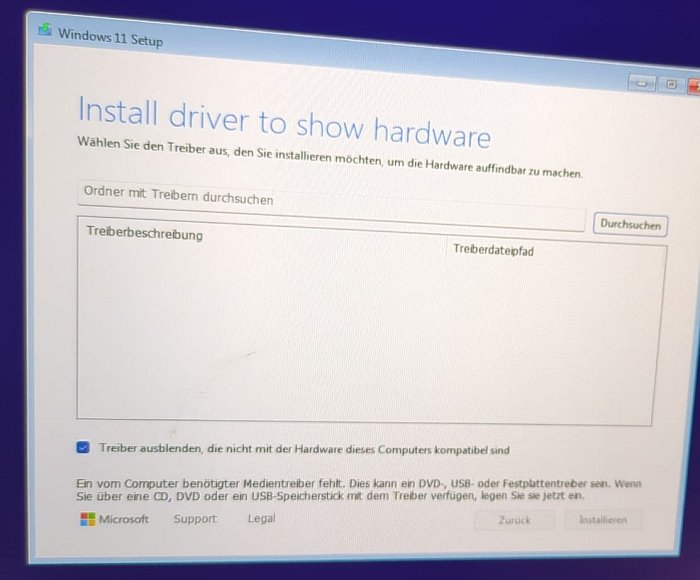 Weil ich vermutete, dass w11 die eingebaute Festplatte nicht erkennt, habe ich mal eine zweite dazugesteckt. Diese erkennt er, man könnte dort Treiber suchen lassen.