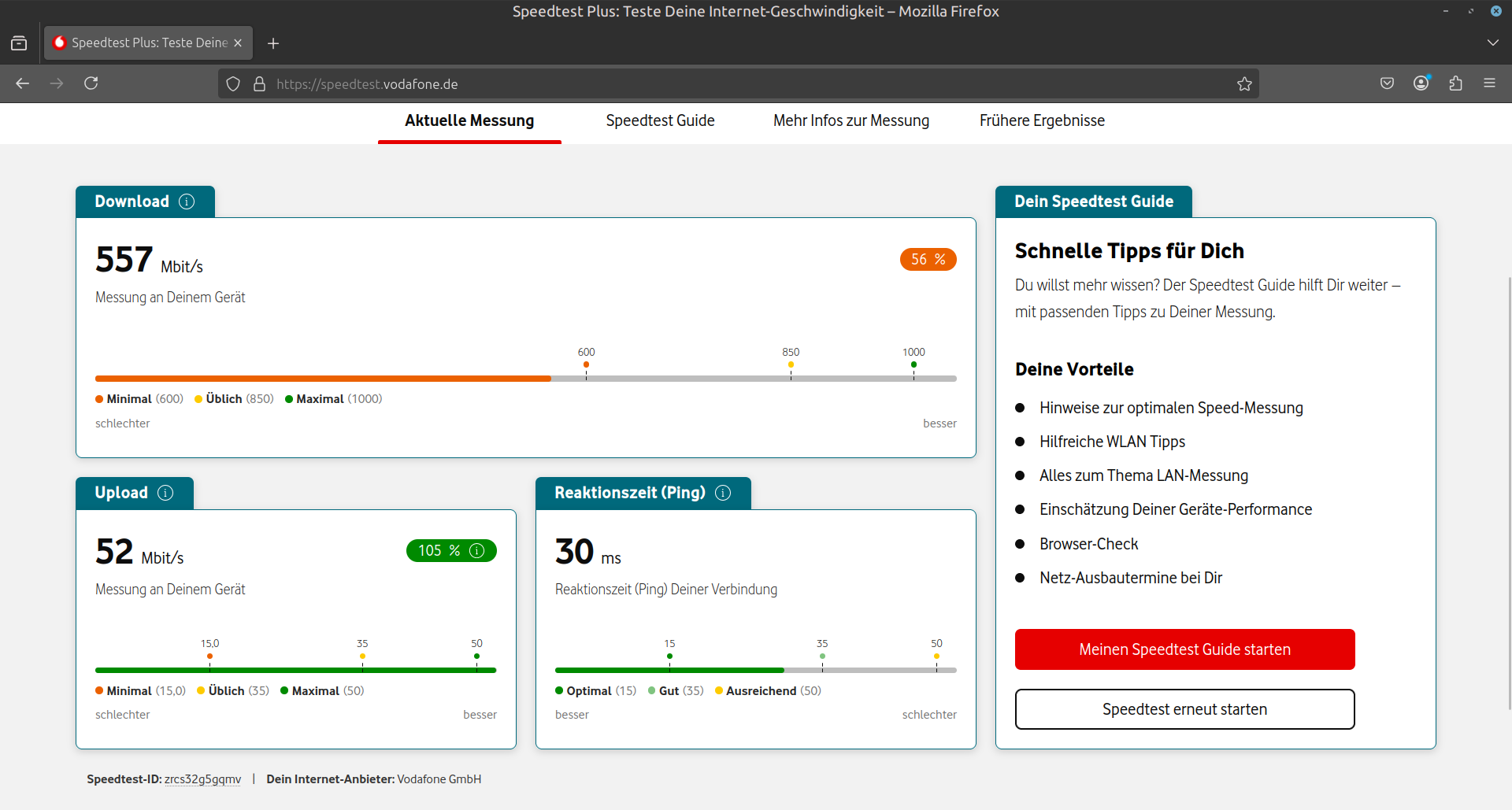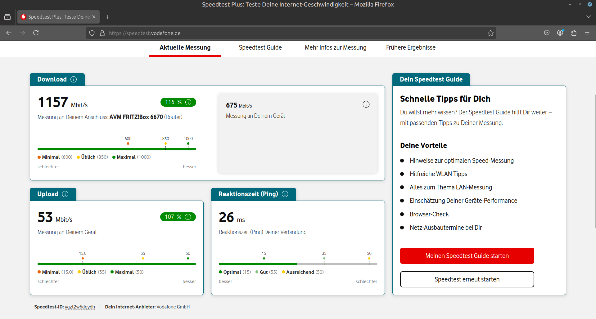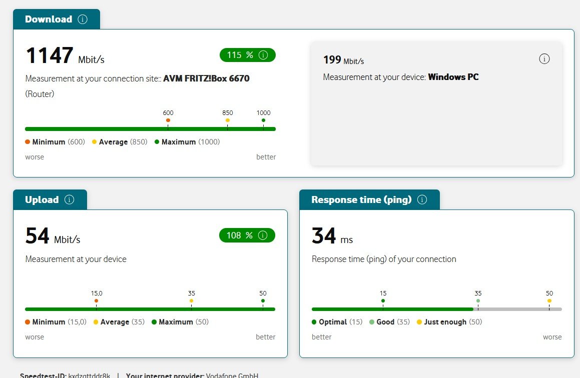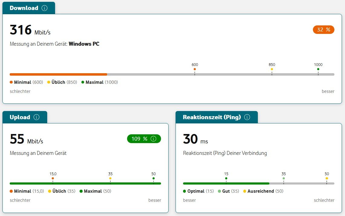 Ich bin umgezogen und genieße nun eine 1000 Mbit/s Leitung von Vodafon/Kabel.