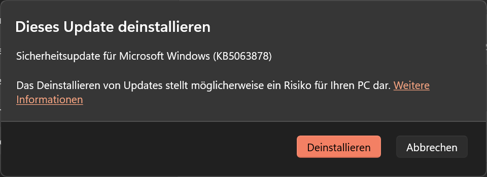 Ich habe einiges gelesen was seit dem rauskommen des KB5063878 Leuten so passiert ist. Von meist nicht funktionierender Installation des Updates. In meinem Falle, all das wusste ich erst nach der Installation des besagten Updates. Und bei mir scheint sich ein anderes Problem seit dem raus zu kristallisieren.
