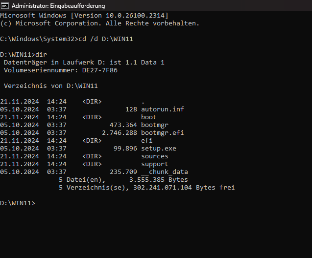 cd /d D:\WIN11 gebe ich jetzt wieder bei cmd ein und danach dir ?Pentagon schrieb:Da du ja so clever warst und jetzt 3 Partitionen hast, machen wir aus Sicherheitsgründen erst eine Installation auf Laufwerk E: