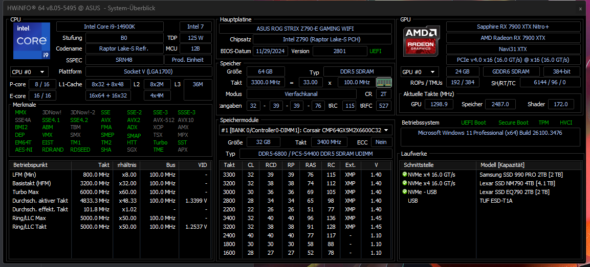 - RAM: Corsair Dominator Platinum RGB Kit 64GB (2x32GB) DDR5-6600 CL32 (CMP64GX5M2X6600C32)