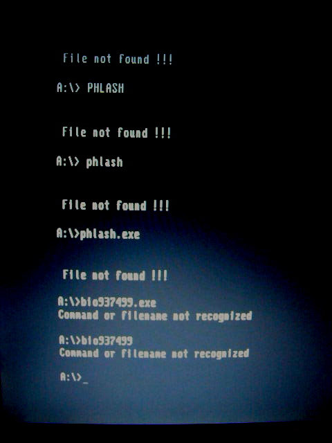 Als ich dann endlich den Prompter A:/ hatte und phlash eingab, findet er die Datei nicht. Siehe Foto.