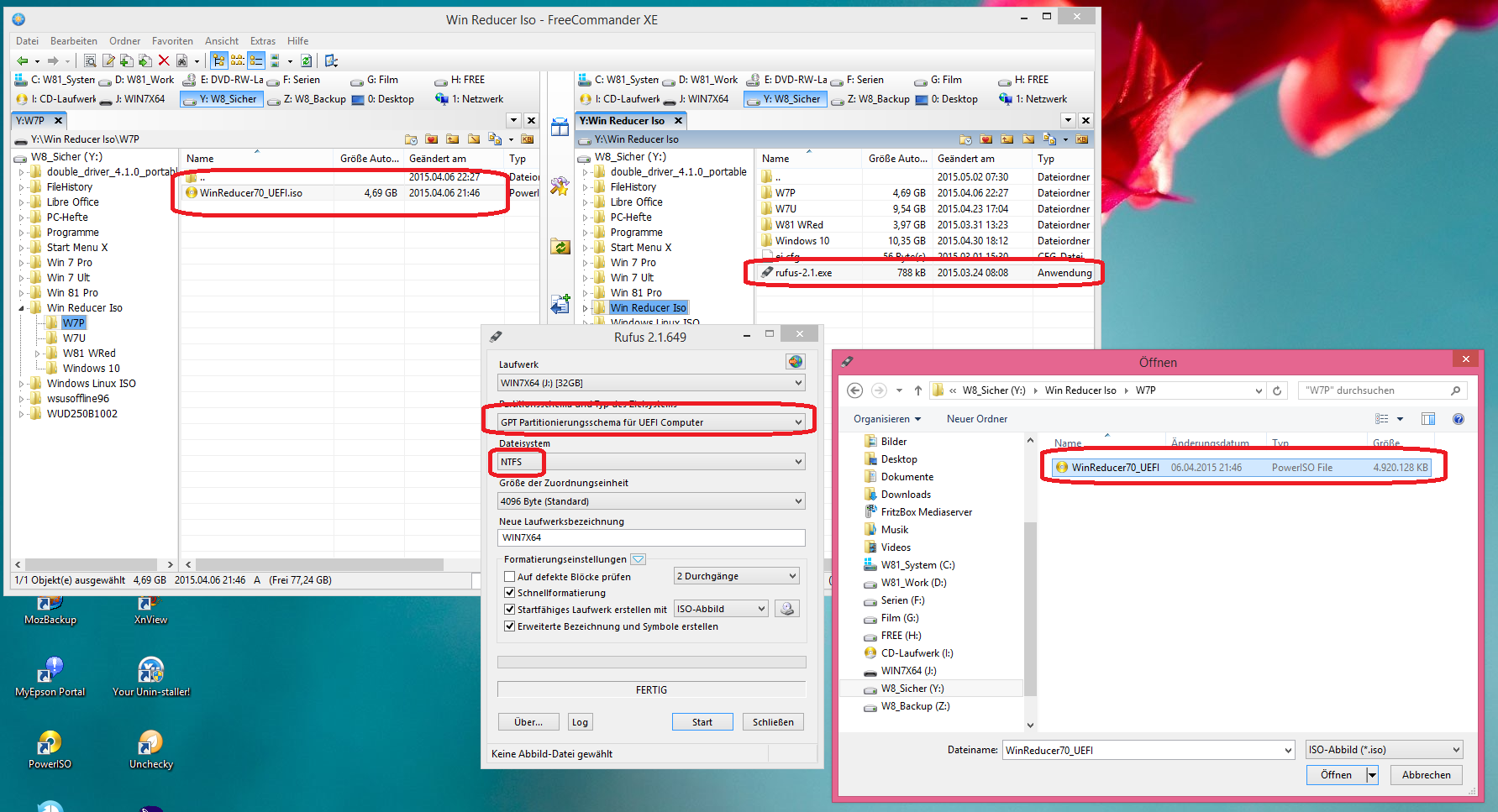 ich bekomme es einfach nicht hin, bzw. mein Compi weigert sich vom Stick zu installieren. Habe einen USB 3.0 Stick (32 GB), einen Laptop ausschließlich mit USB 3.0 Ports und eine ISO-Datei von Windows 7 64 Bit. Ich habe ein Tool: rufus-2.1. In diesem Programm kann ich einstellen: GPT für UEFI + FAT32 + startfähiges Laufwerk erstellen. Was funktioniert.