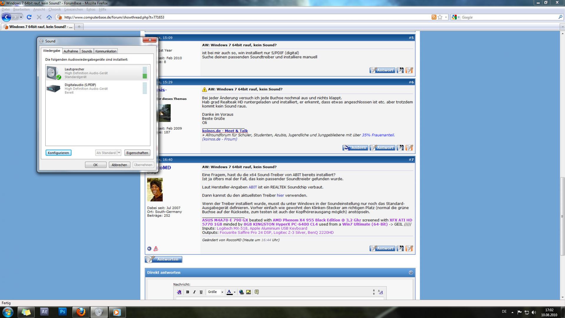 Es wird überall angezeigt, dass Sound läuft, jedoch hab ich es schon mit ca. 5 verschiedenen Kopfhörern bzw. Boxen versucht und der Sound kommt nicht raus.
