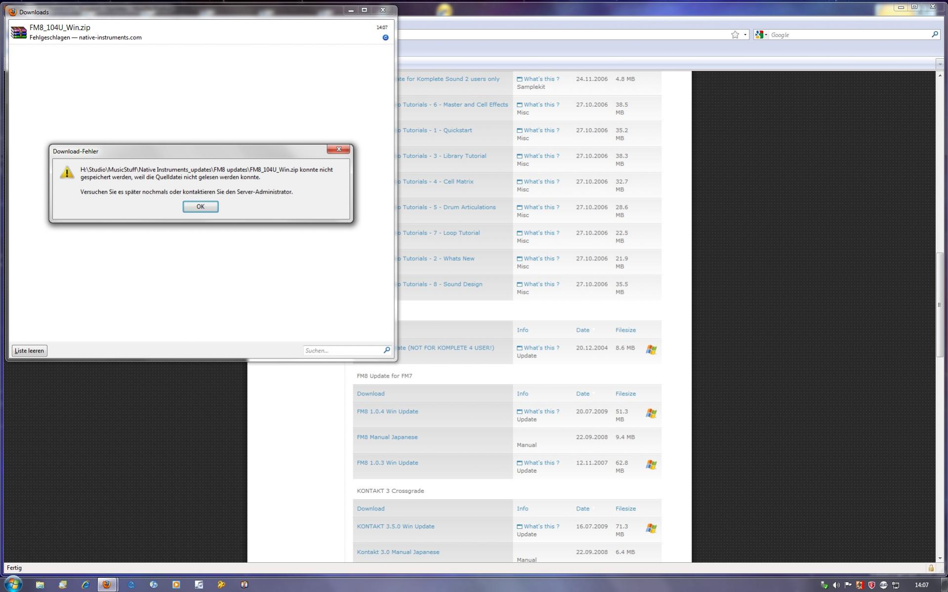Kanns mir nicht erklären! Mitn Server wo ichs laden wollte ( Native Instruments ) hats mit Sicherheit nichts zu tun den die Datei konnte ich dann vom Laptop mit Vist 32bit ohne Probleme laden!
