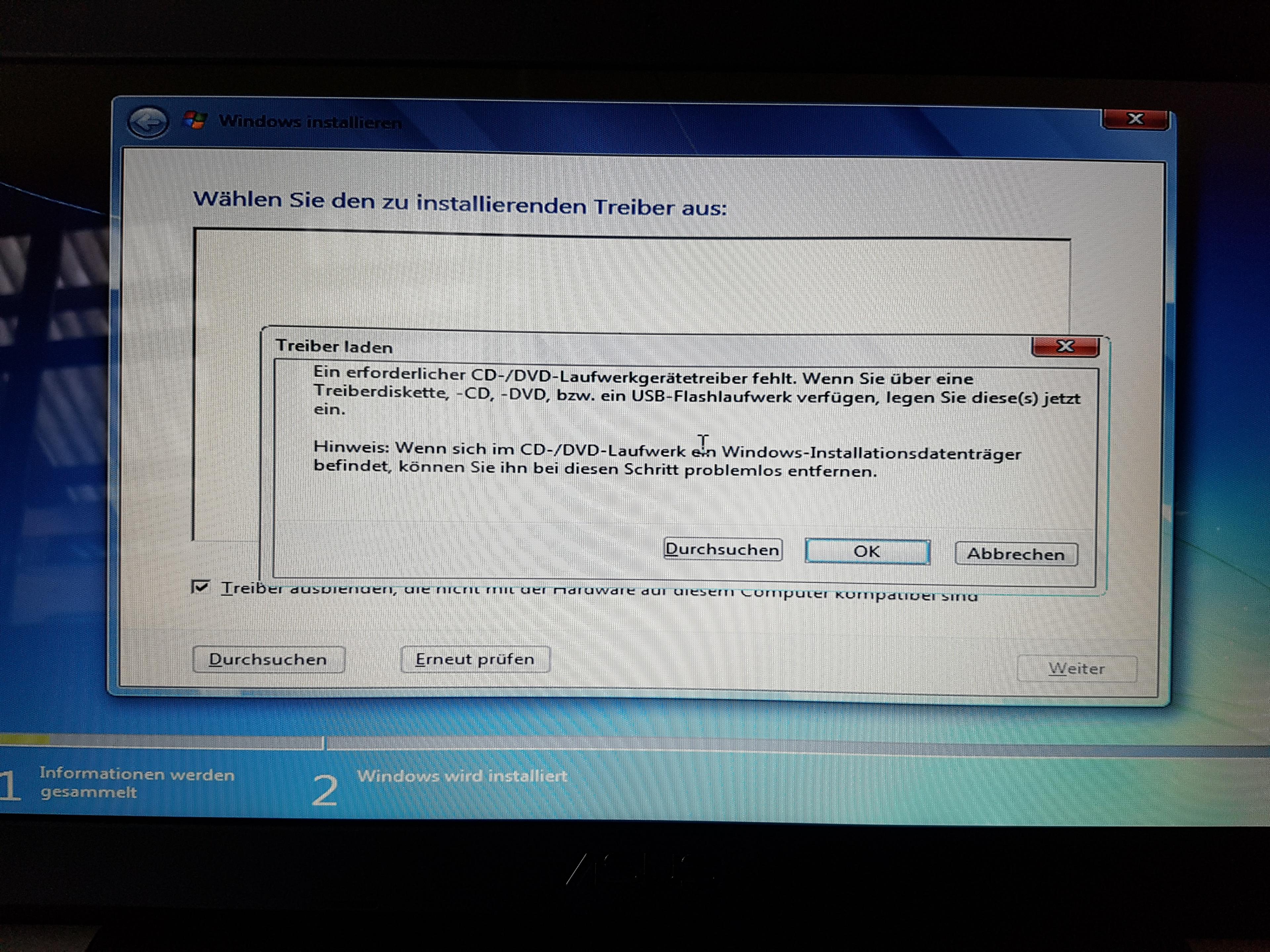 Die Windows 7 .iso habe ich auf einen USB Stick geladen (Microsoft USB Tool), und ich kann auch damit die Installation beginnen. Dann taucht aber schon die Fehlermeldung mit fehlenden Treibern auf... siehe Screenshot anbei. Das Einlegen der beigelegten ASUS-CD bringt leider nichts.
