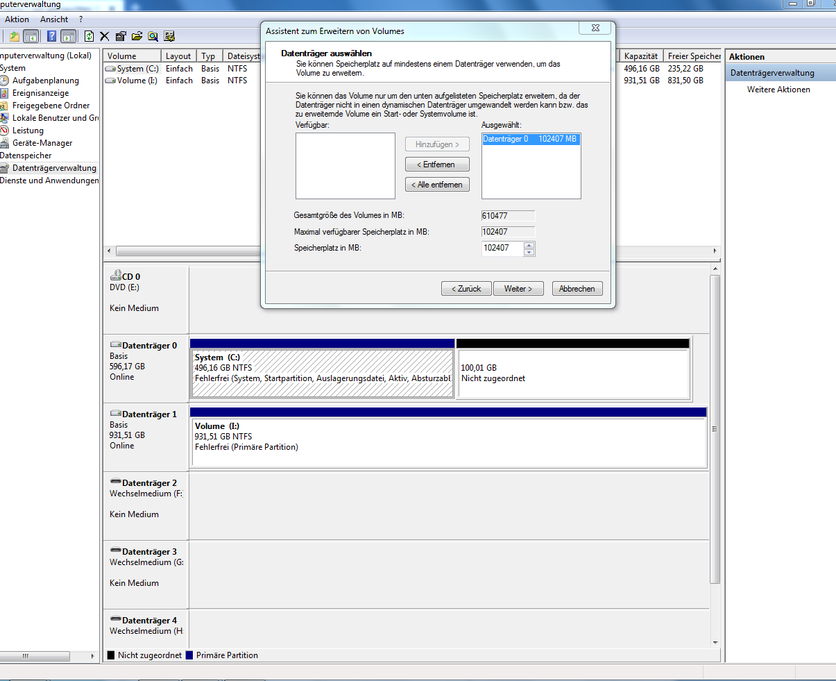 OK, das hat geklappt.HerrAbisZ schrieb:Wenn du C: um die 102 GB vergrößern willst, einfach auf weiter klicken